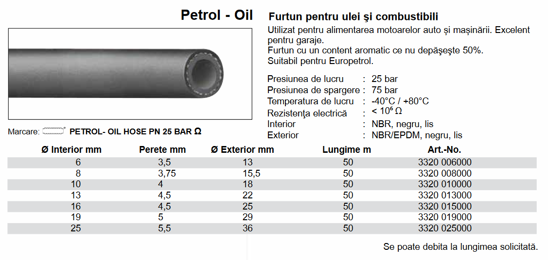 Furtun cauciuc, ulei şi combustibili, 25 Bar