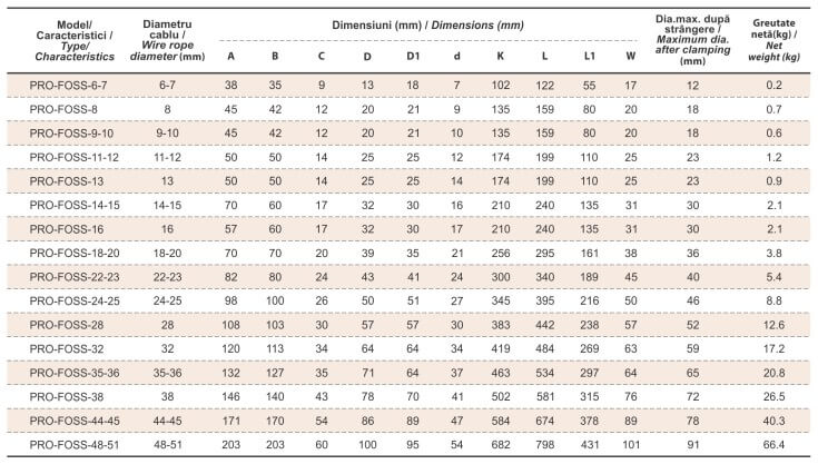 Aplicați corespunzator, sockeții tip PRO-FOSS au o rată de eficiență de 100%, în funcție de rezistența nominală a cablului. Sockeții deschiși sunt recomandați pentru a fi folosiți împreună cu cabluri având construcțiile 6x19, 6x37 și inimă metalică; de asemenea, sunt aprobați pentru a fi folosiți împreună cu cablurile zincate pentru poduri.