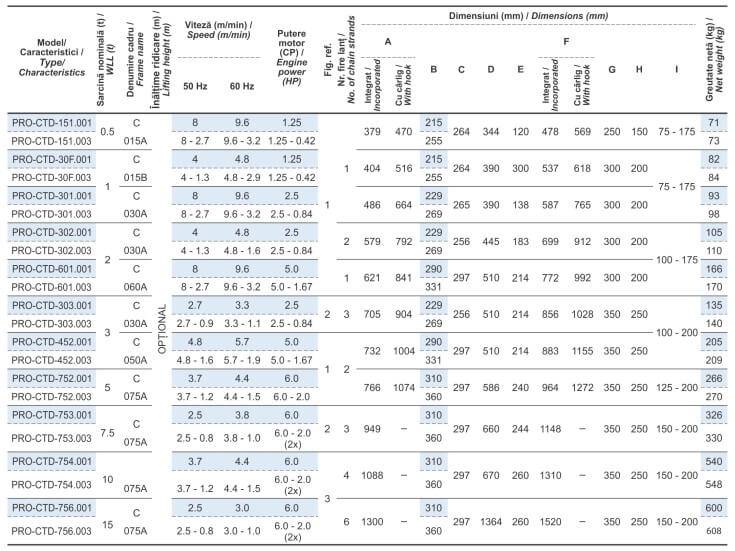 Terminația 001 din codul modelului reprezintă palanul cu simplă viteză, iar terminația 003 reprezintă palanul cu dublă viteză.