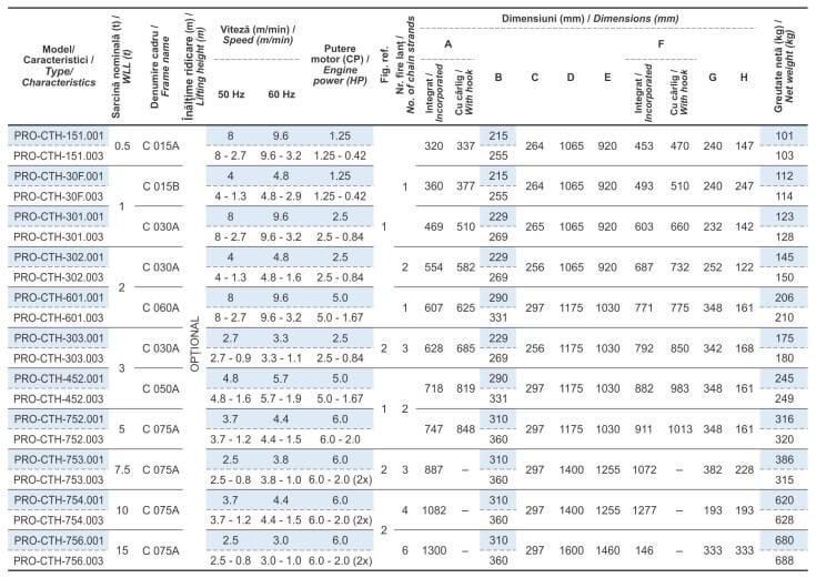 Terminația 001 din codul modelului reprezintă palanul cu simplă viteză, iar terminația 003 reprezintă palanul cu dublă viteză.