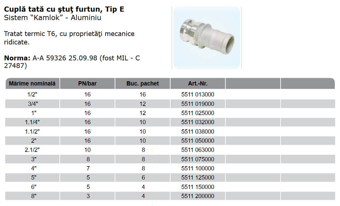 Kamlok tată cu ştuţ furtun, Tip E