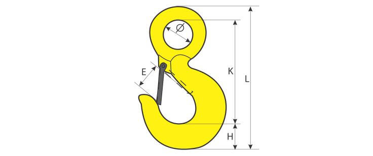 Cârligul cu ochi și siguranță este un accesoriu de ridicare folosit în special la capătul inferior al șufelor din cablu cu inimă vegetală sau al șufelor din cablu cu inimă metalică.